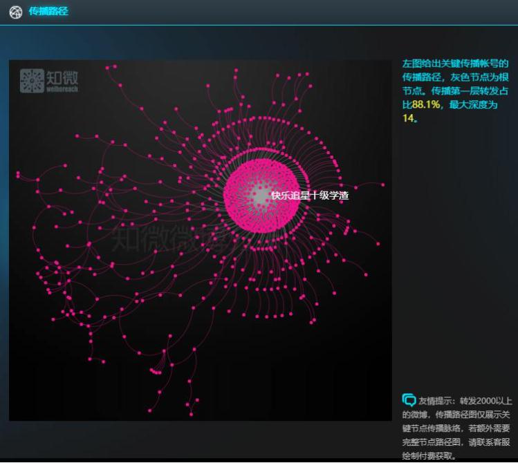 这条微博的发布时间与《合成大西瓜》上线时间一致,且获得一万多转发。知微传播路径分析显示,@快乐追星十级学渣 是传播路径的根节点,最大传播深度为14。