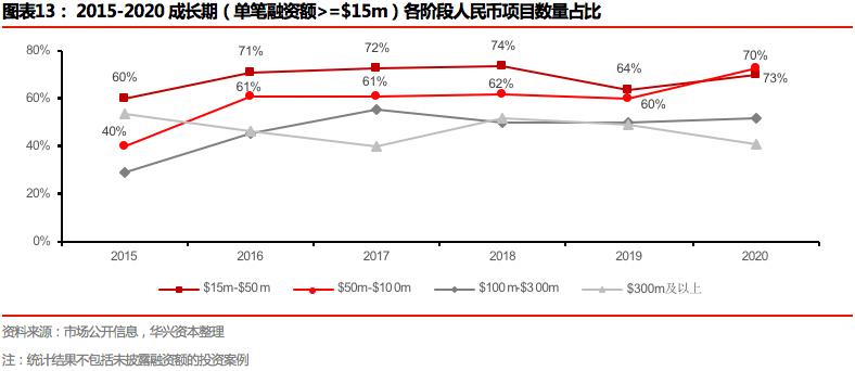 项目币种分布方面,在初创期阶段,人民币项目处于市场绝对主导地位,在整体交易量中的占比稳定在九成以上。而成长期阶段人民币项目占比则稳定在六成左右,其中,单笔融资额在1亿美元以下的各阶段人民币项目占比主要在60%-75%之间波动,而单笔融资在1亿美元及以上的人民币项目占比则主要在40%-55%之间波动,存在显著差异。