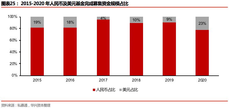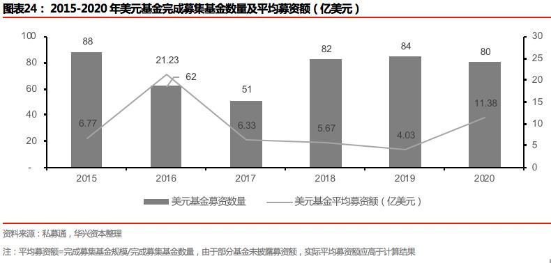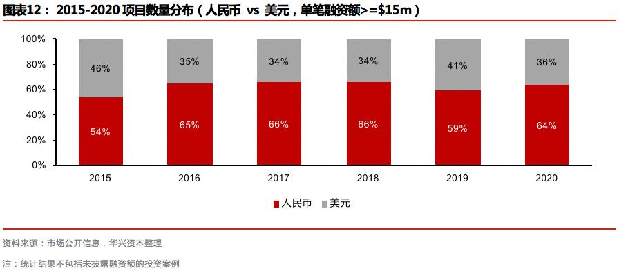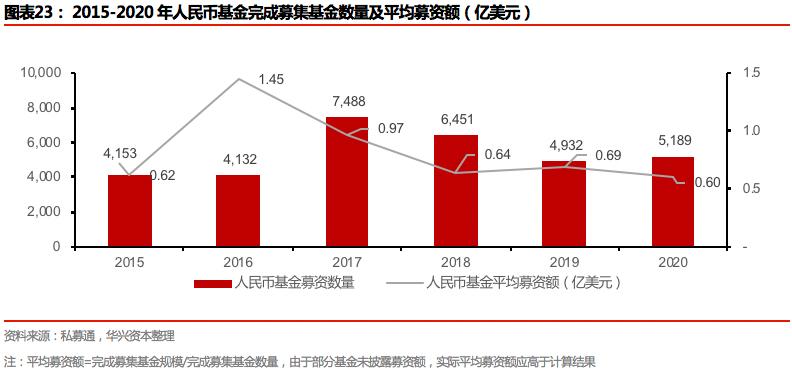 美元募资方面,2020年大额美元募资事件频发,因此在募资数量整体保持稳定的情况下,募资规模得到大幅提升,带动美元基金募资规模占比提升至23%的水平。这亦体现海外投资人持续看好中国经济,特别是在2020年新冠疫情的冲击下,中国经济快速恢复,也进一步增强了海外投资人的信心。