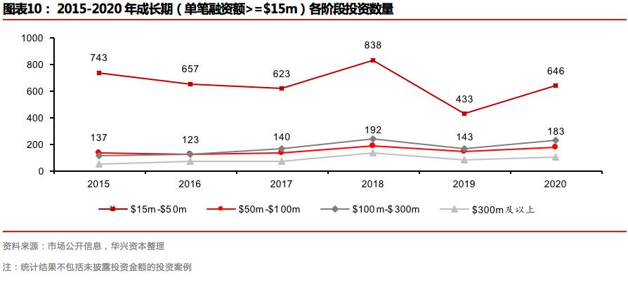 与初创期阶段有所不同,成长期(单笔融资额>=$15m)阶段的投资数量则呈现波动的状态,在2018年达到近几年行业高峰,随着行业遇冷,在2019年又骤然下降。而2020年伴随市场进入回暖周期,成长期阶段投资数量开始大幅提升,达到1,172起,同比增加42%;其中,单笔融资额在1,500万美金至5,000万美金区间的投资数量为646起,同比增长49%,涨幅最大。
