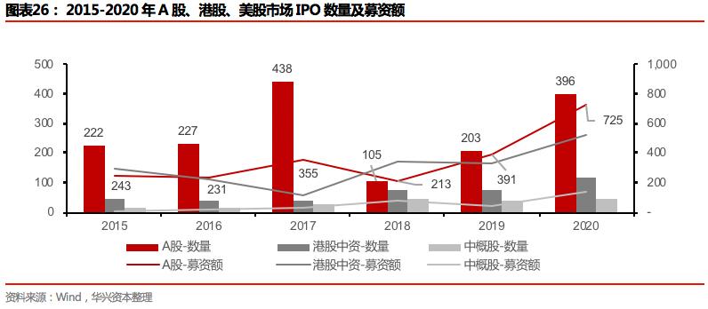 美股市场方面,2020年上半年,面对新冠疫情的全球大流行,美股市场出现多次熔断,结束了过去长达11年的牛市行情,同时,数家中概股接连自爆财务造假,引发了中概股信任危机,中概股审核或将趋严。虽然美股市场仍存众多不确定性,但相对宽松的准入门槛,使得中企赴美上市热潮依旧不减,2020年中概股IPO企业数量为42家,同比增加11%;受陆金所、贝壳找房、小鹏汽车、理想汽车等大额IPO募资事件影响,募资总额达142亿美元,同比上升219%。