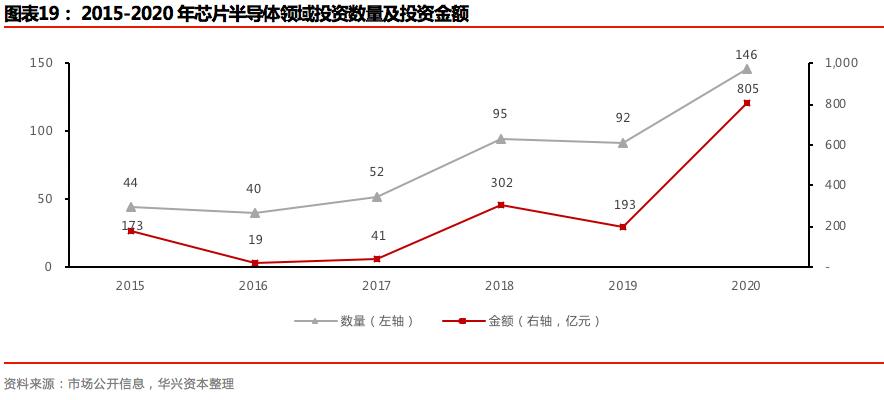 其中,芯片半导体领域的交易热度在2020年大幅上升,年度内投资事件数量达146起,同比增加59%,融资金额为805亿元,同比骤增317%。受美国制裁华为事件的影响,为避免在芯片半导体等关键技术领域持续被美国制约,国家开始大力支持芯片半导体行业的发展。该板块的投资机遇同时存在于一二级市场之中,目前一级市场的投资重点集中在IC设计层面,应用领域集中于消费电子供应链和AI芯片方向,投资逻辑以国产替代、高端替代低端为主。