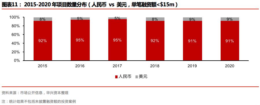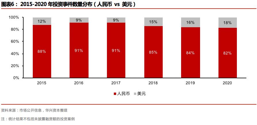 与此同时,市场结构呈现积极变化。从交易币种来看,2016年以来,美元市场整体趋向走强,投资数量占比由2016年的9%提升至2020的18%,市场份额增加了一倍。具体而言,美元市场在2018年较为火热,投资数量占比大幅提升;而2019年,伴随市场整体遇冷,美元基金的投资活跃度开始同步降低,投资数量占比仅有小幅提升;2020年,受疫情影响,在全球经济受挫的背景下,中国经济的快速恢复也增强了海外投资人对中国市场的信心,美元市场投资数量占比进一步提升。