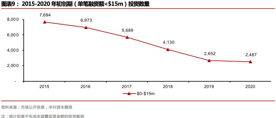 我们对市场已披露融资金额的案例进行了分析。从阶段分布上来看,初创期(单笔融资额<$15m)阶段的投资数量自2015年以来,总体保持下降的趋势,2020年仅为2,487起,同比下降6%。与此同时,初创期阶段项目在市场中交易中所占比重也在不断下降,已经由2015年的88%下降至2020年的68%。