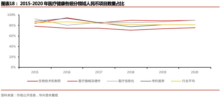此外,由于医疗健康各细分领域的行业特点有所不同,相应的交易结构也存在一定的差异。从币种分布上来看,医疗健康行业中人民币项目依旧占主体地位,占比在最近三年稳定在81.5%的水平。而生物技术和制药领域公司通常需要先进行长期巨额的研发投入才能获得高额的回报,这类公司往往更受美元基金的欢迎,因此,该领域人民币项目占比略低于行业平均水平,总体在70%-80%之间波动。而医疗器械领域人民币项目占比则在行业平均水平之上,这与该领域企业主要选择在A股上市有关。当前,A股医疗器械板块上市公司接近60家,行业龙头企业迈瑞医疗市值已经超过5,300亿人民币,自2018年10月上市至今翻了近9倍。