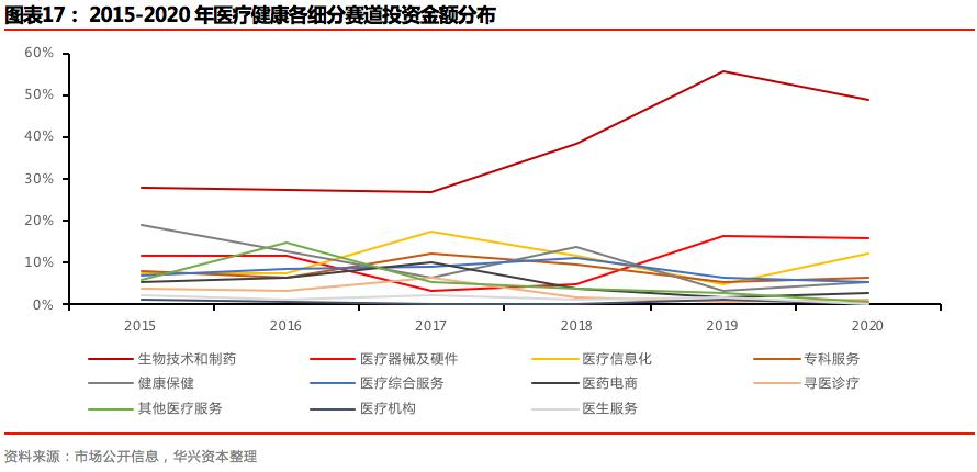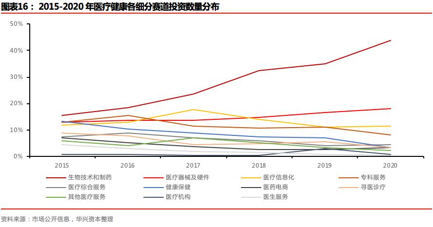 其中,生物技术和制药领域在近几年快速攀升成为热度最高的细分赛道,其为医疗领域贡献的交易量和交易金额比例已经分别由2015年的15.3%、28.1%提升至2020年的44.0%、48.9%。此外,医疗器械和医疗信息化受到的关注程度也较高,两个细分领域合计为医疗领域带来了29.5%的交易量和28.2%的交易金额。