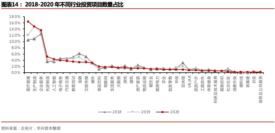 医疗健康一直是备受资本追捧的行业,在经济下行周期,医疗健康作为抗周期性行业的典型代表,更容易受到资本关注,而新冠疫情也进一步催化了资本对医疗健康行业的投资热情。在这样的背景下,医疗健康已经成为了红杉资本、高瓴资本、启明创投等一线基金重仓布局的大赛道,也是2020年市场上最为火热的赛道,投资数量和投资金额占比分别高达16.5%、21.9%,均处于市场第一位。