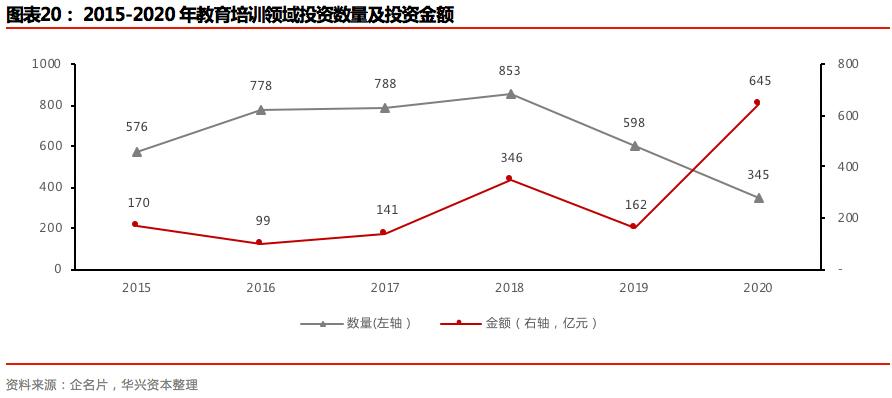 教育培训领域,行业加速分化,资源向头部集中的趋势越发明显。2017-2018年,教育培训是市场上的热门赛道,该领域内的投资数量及投资金额双双提升;2018年,在资本市场遇冷的背景下,国家政策频出,市场竞争日趋激烈,在线教育投放成本快速攀升,教育板块也开始降温,带动行业竞争格局分化;2020年,在疫情的影响下,线上教育业绩暴增,加上行业格局日渐明朗,猿辅导、作业帮、掌门1对1等头部项目纷纷获得资本大额资金加持,尽管教育领域投资数量仍保持下降趋势,但整体投资金额大幅上升。企名片数据显示,2020年,教育板块发生的投资事件数量为345起,同比下降42%,而投资金额达到了645亿元,同比提升298%。
