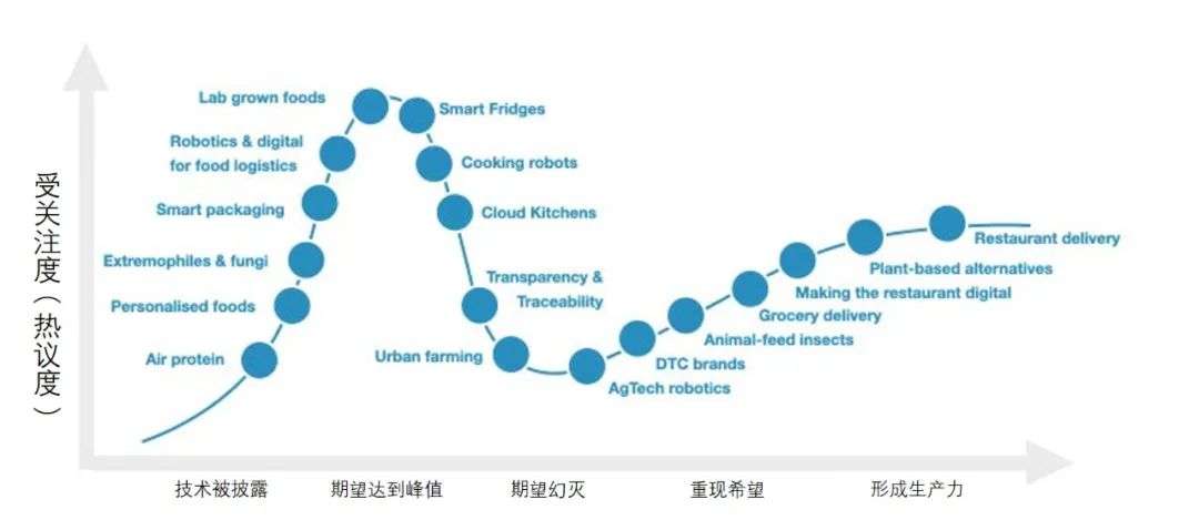 从图中不难看出,很多获得一致看好,乃至大量资本蜂拥而入的技术领域,得益于媒体报道所引发的广泛关注,比如以云计算和人工智能为底层技术的“云厨房”、“智能冰箱”、“烹饪机器人”等。与成功走向商业应用的“餐厅数字化”、“替代蛋白”、“餐饮配送”等相比,刚刚迈过期望峰值的明星技术大概率会经历一个发展的低潮时期,继而在徘徊或谨慎前行中等待再次爆发,或者趋于彻底沉寂。