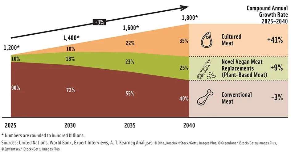 2025-2040年,全球肉类消费趋势。图片来源:A.T. Kearney