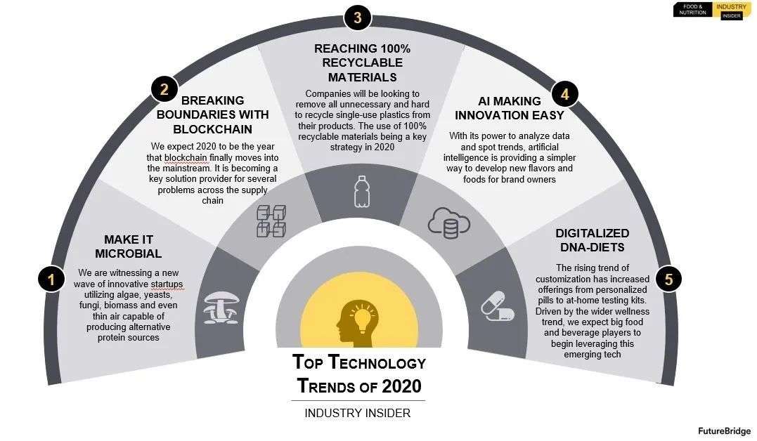 2020年1月23日,futurebridge网站发布了2020食品技术趋势预测,当下被人们耳熟能详、高频见诸报端的微生物发酵生产人造食品、区块链、人工智能、个性化营养、可再生包装等悉数上榜。