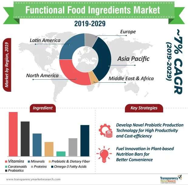 据Statista的预测,全球功能食品配料的市场规模将从2020年的779亿美元增至2023年的942亿美元。亚太是功能型配料最具活力的市场,维生素、益生菌和omega-3脂肪酸,位列销售额TOP3。