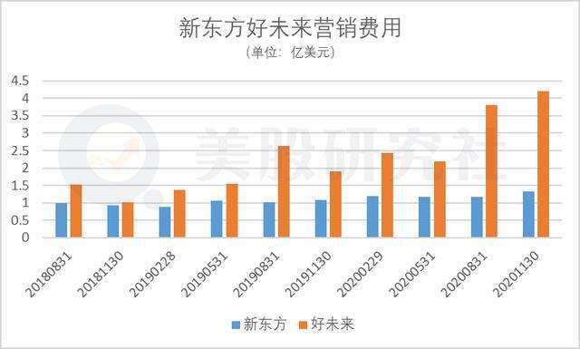 对比新东方与好未来的营销费用来看,重视发展线上的好未来在该支出上不断攀升。最新财报来看,三季度好未来在营销上的费用从去年同期的1.9亿美元,上升到了4.2亿美元,同比增长120%。