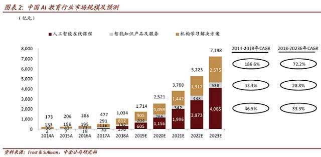 在各种技术中,AI被在线教育运用得最多。当下,AI教育仍处于市场爆发前夜。Frost &Sullivan发布的数据显示,AI教育市场由人工智能在线课程、机构学习解决方案和智能知识产品及服务三部分组成,预计2018-2023年增长复合率为47.4%,2023年将达到7198亿元。