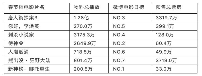 从营销数据来看,七部春节档电影之间的“厮杀”颇为激烈 :《新神榜:哪吒重生》物料总播放数最少,但是位列微博电影日榜第一位;《熊出没 · 狂野大陆》在微博电影日榜中排在末位,但是在预售总票房上成绩喜人,截至1月29日12:30,其预售总票房为3719.0万,排在七部预售影片的第一位;去年未能及时上映的《唐人街探案3》目前物料总播放数第一,预售总票房排在第二位。