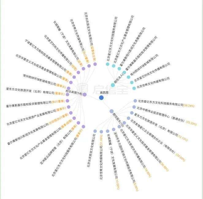 启信宝显示,截至目前,高希希在星亿东方、霍尔果斯恒兴影视、北京世希文化、北京星艺时尚等7家公司担任法定代表人,同时还在星亿东方、长城荣耀、华夏忠义文化等10家公司持有股权。值得注意的是,高希希名下这些公司,有8家被股权冻结,仅星亿东方一家公司就涉及3条股权冻结信息。
