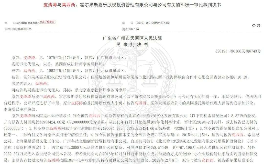 但最终,高希希与北京希世纪并未完成这场“上市目标对赌”。根据协议,高希希不仅需要归还皮涛涛投资款及利息共3600万元,还需支付2000万元违约金。