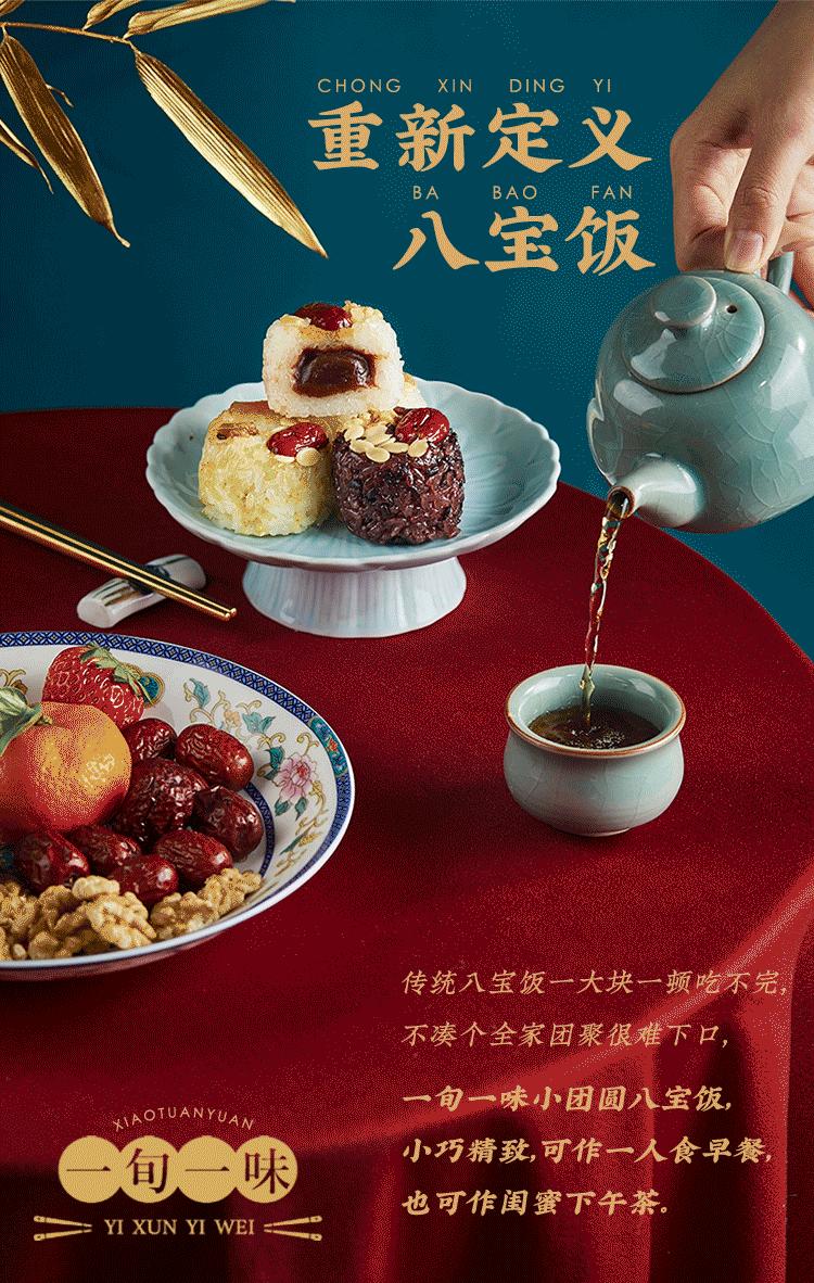 比如在大众印象中,八宝饭只会出现在全家聚会、酒席等场景,即便是平时想吃,但想起独自吃完一大块,不仅太过甜腻实在吃不下,卡路里爆表也会带来满满的负罪感。因此一旬一味挖掘了年轻人一人食的需求,推出了小巧精致的“小团圆”八宝饭,能让消费者自己控制食量。