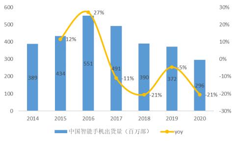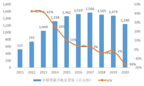 Couterpoint和Digitimes的数据显示,全球智能手机出货量增速2013年以来逐年下滑,自2018年起一直处于负增长,出货量自2017年达到顶峰15.7亿台以后,一路下滑至2020年的12.4亿台。从信通院和IDC的数据也可以看出,中国智能手机出货量在2016年达到顶峰5.5亿台后一路下滑,2020年仅为2.96亿台,中国智能手机出货量增速2016年至2020年一直处于负增长。全球智能手机市场早已步入成熟期,并呈现逐年萎缩的态势,市场亟需新的引爆点来催生新一波“换机潮”。折叠屏手机作为革命性技术的出现,能够刺激消费者产生新的需求。除了技术创新和高科技作为亮点,在智能手机追求大屏化的趋势下,折叠屏手机还能够切实解决大屏与产品便携之间的矛盾,分屏模式的使用也十分便捷。