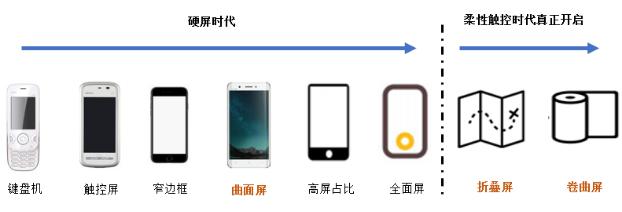 纵观手机的屏幕迭代历程可知,手机的输入途径由键盘变为触控,而后触控屏在手机中的占比不断提升,一直到全面屏时代占据了手机的整个平面。在全面屏时代之后,手机行业开始全面探索柔性触控在手机中的应用。技术上,目前已经迭代至折叠屏,已有较为成熟的产品上市。但折叠屏只是手机屏幕的一个过渡形态,卷曲屏或将成为手机屏幕的终极形态。与折叠屏相比,卷曲屏可以通过卷曲的方式节省更大的空间,携带更为方便,更不易损坏。卷曲屏的概念、技术和配套产业链尚未产生萌芽,折叠屏手机作为过渡形态,随着产业链规模的扩大和技术不断完善,成本不断下降,或将成为智能手机的下一代普及产品。