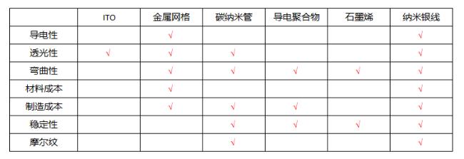 纳米银线特性优于ITO和金属网格。从导电膜的属性考虑,纳米银线是实现柔性屏的最佳方案。与ITO、金属网络、碳纳米管等材料相比,银纳米线具有导电性好、透光性佳、弯曲性好、成本低、稳定性好、无摩尔纹等优势,是新一代人机交互的关键材料,是柔性触摸屏、大尺寸触摸屏的绝佳材料。