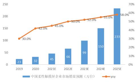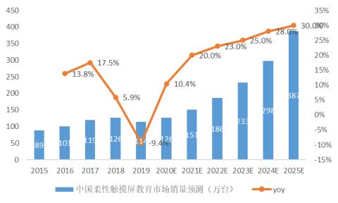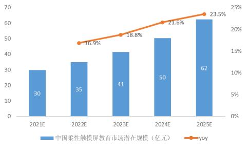 预计2021年,柔性触摸屏每平方厘米价格为0.1元,并以平均每年5%的幅度下降。根据中国交互电子白板的销量预测,预计2021至2025年,柔性触摸屏在教育市场的潜在市场规模分别为30亿元,35亿元,41亿元,50亿元和62亿元,5年合计市场规模为约为219亿元,预计2021至2025年复合增长率约为20.1%。