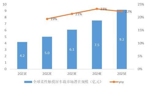 柔性中控触摸屏作为人车交互的核心平台,预计将首先在新能源汽车全面渗透。我们预计2021-2025年,全球新能源车销量分别为300万台,366万台,454万台,572万台和715万台。预计2021年每台车的屏幕总面积约为1400平方厘米(屏幕尺寸17英寸),每年按3%增长;预计柔性触摸屏价格为0.1元,并以平均每年5%的幅度下降。预计2021至2025年,柔性触摸屏在车载市场的潜在规模分别为4.2亿元,5亿元,6.1亿元,7.5亿元和9.2亿元,合计约32亿元,预计年复合增长率约为21.6%。