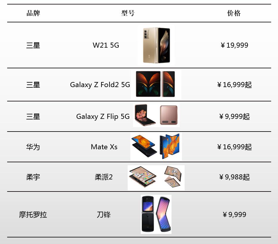 各大品牌积极布局折叠屏手机市场,折叠屏手机或将开启智能手机市场的下一轮“换机潮”。三星、华为和柔宇科技已有可折叠手机上市。三星作为可折叠手机的龙头品牌,主要有3款在售机型,分别是W21,Galaxy Z Fold和Galaxy Z Flip 5G,售价分别为19,999元,16,999元和9,999元。华为旗下唯一一款可折叠机型MateXs,售价16,999元起。柔宇科技推出的柔派2,售价¥9,988起。此外,摩托罗拉、TCL、LG等企业已发布折叠屏手机的概念机,苹果、小米、OPPO等厂商也在进行折叠屏技术的研究,并纷纷推出折叠屏手机的产品规划。