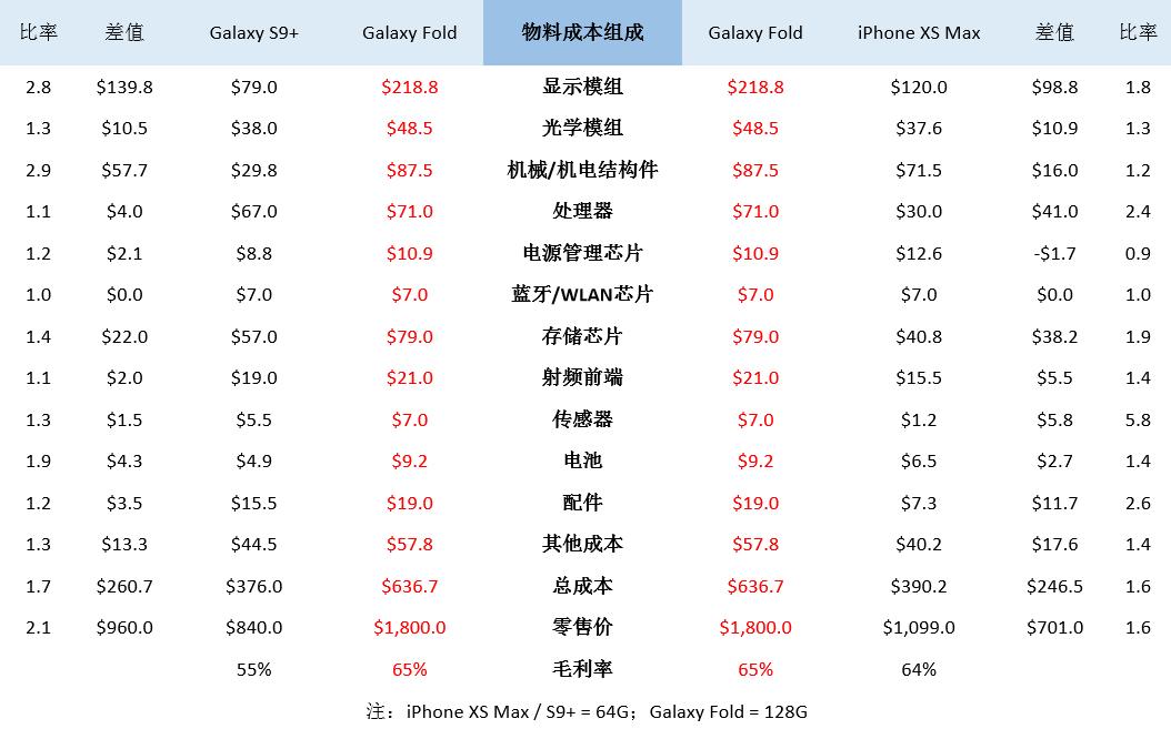 以三星Galaxy Fold为例,其整机物料成本高达636.7美元,比Galaxy S9+高出了260.7美元,比iPhone XS Max高出了246.5美元。从表格中可以看出,Galaxy Fold的高昂成本主要源于显示膜组、机械/机电结构件,电池和存储芯片四个方面。显示模组成本增加,原因在于屏幕面积增加及折叠屏本身的产能、良率不高。Galaxy Fold的触摸屏面积是Galaxy S9+的三倍。机械/机电结构件成本增加,是因为在折叠处增加了铰链设计,在盖板、铰链和两个隔离框中增加了金属用量。电池成本增加,原因在于屏幕尺寸增加使得屏幕耗电更快,需要配备更大容量的电池,以华为Mate Xs为例,在每一片显示屏都配备了一块电池。存储芯片成本增加,原因在于折叠屏手机屏幕尺寸增加,显示内容也增加,再加上分屏应用等多项功能,对存储和计算的要求也相应提高。以65%的毛利率来计算,成本每增加1美元,售价增加2.86美元。因此,柔性OLED面板价格能否大幅下降,以及机身的金属用量能否进一步减少,是折叠屏手机物料成本能否下降的关键因素。