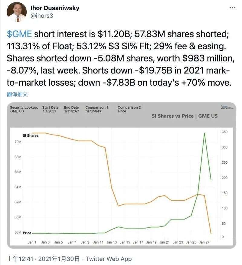 据S3 Partners负责人Ihor Dusaniwsky周五发布的推特,GME目前被做空的流通股比例仍然达113.31%。被做空凭什么能超过100%,这个被代表散户登上CNBC发言的Chamath质疑的现象仍在持续。做空股数远超过总股本,意味着必然有空头无股可买,无法下车,只能被火箭般的股价绑着冲向可怕的终局。