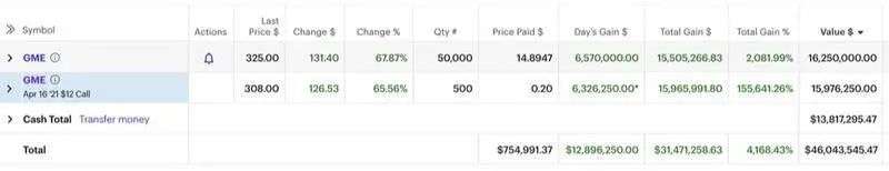 周五盘后,DFV例行更新了自己的持仓。DFV在股价最低点买入五万美金游戏驿站(GME)看涨期权,最新的账户持仓已达到4600万美元,包括GME股票、期权以及一千多万美元的现金。
