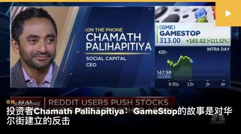在WSB散户高唱着打倒华尔街时,一部分传统意义上的“大佬”为散户辩护,并加入做多军团中。早就对华尔街空头看不顺眼的埃隆·马斯克(Elon Musk)在推特上站队WSB。Facebook早期员工、硅谷风投Social Capital创始人查马斯·帕里哈皮蒂亚(Chamath Palihapitiya)公开表示买入GME看涨期权,并在CNBC电视节目中舌战主持人,“他们显示的力量和华尔街同等重要。”