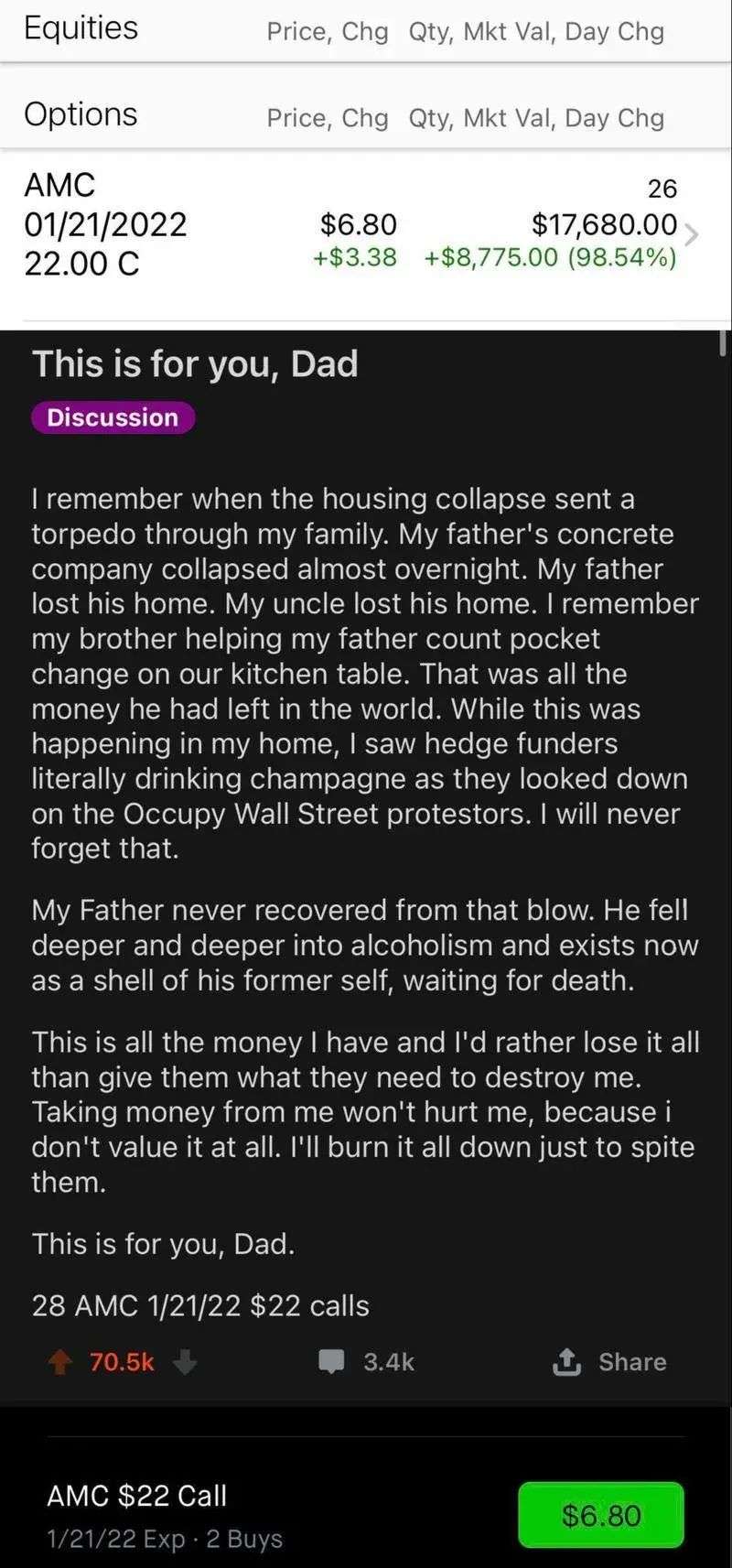 周四,一条WSB用户直接讨伐华尔街机构的檄文广泛流传,指责他们在2008年的金融危机中给数以百万的普通民众制造了莫大的苦难,却没有受到任何惩罚,反而得到救助。在周五盘前,另一条感情充沛的宣言在WSB版内又被顶上热门。