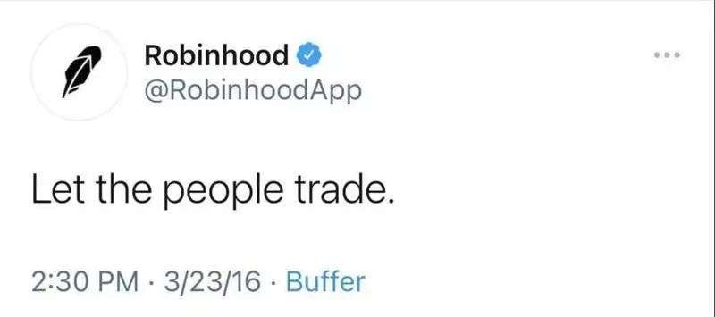 事实上,在特斯拉、蔚来等股票暴涨逼空的过程中,散户早已粉墨登场。Robinhood在2016年曾宣告,让人民交易吧!号称使命是通过提供对公司股票、期权和ETF的免佣金交易,实现“全民金融民主化”。