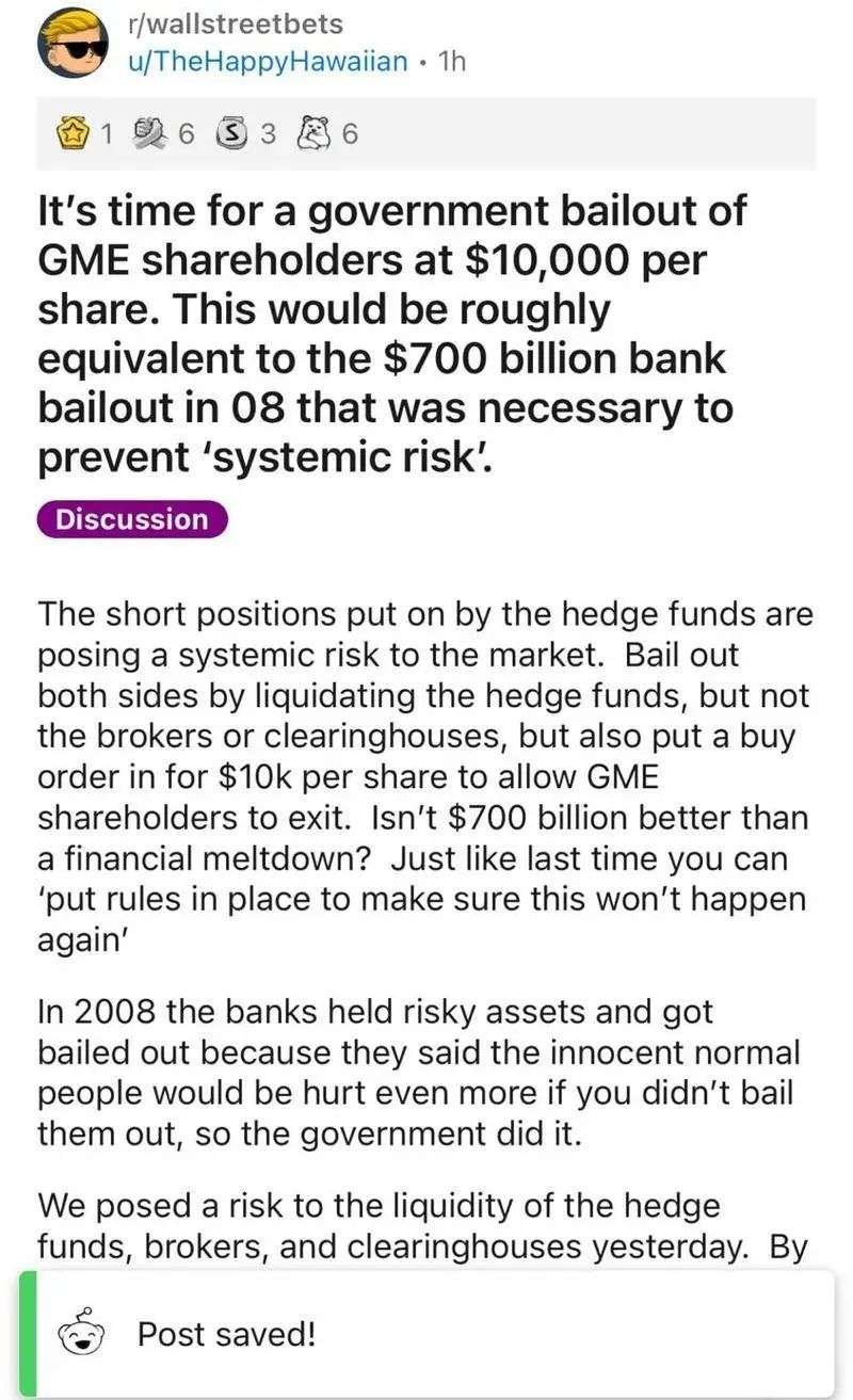例如,名为TheHappyHawaiian的用户出了一个主意:我们应该把GME股价推到10,000美元,然后让政府来托底(bailout)。为什么是这个数字呢?这其中的逻辑是,在这一价格,对冲基金、投行和清算所出现流动性危机,被迫赎回资产如股票、债券等,杠杆反噬,将给整个金融市场带来系统性的风险。政府将需要提供大约7000亿美元的纾困资金防止金融危机,而这正是2008年政府救助银行的价格。