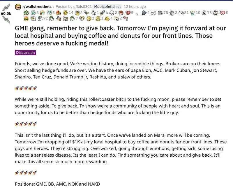另一位则表示,自己周末将买上咖啡、甜甜圈送到当地医院,慰问一线的医护人员,“GME gang, remember to give back!”