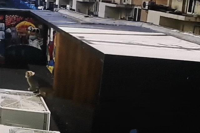 6 分钟后,它沿小学东门口的石狮子爬下,独自穿过车水马龙的南新华街,在两位路人的注视下迅速翻越了附中东校区南门南侧的栏杆,全程不到 10 秒钟,仿佛在向他们展示自己高超的攀爬技能。