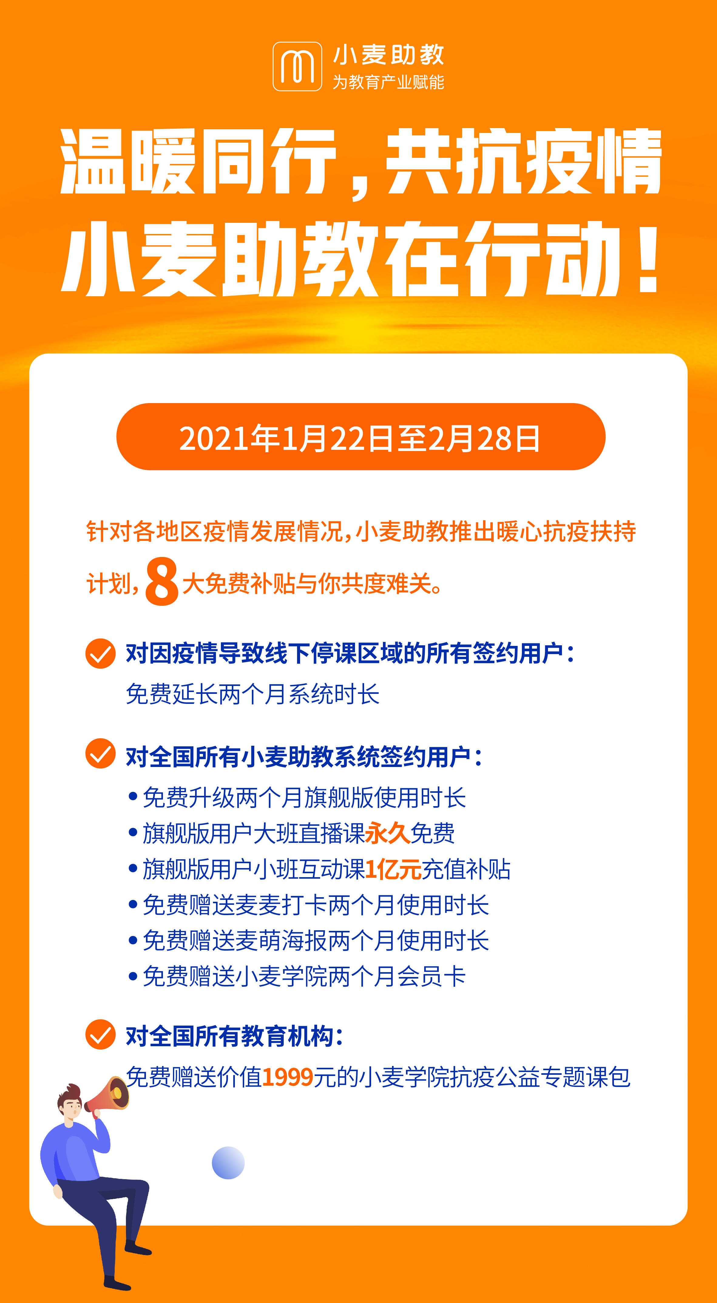 2021年1月22日至2月28日,因疫情导致线下停课区域的所有小麦助教系统用户:免费延长两个月系统时长;其中,对全国所有小麦助教系统用户:免费升级两个月旗舰版使用时长;旗舰版用户大班直播永久免费;旗舰版用户小班互动课1亿元充值补贴;免费赠送麦麦打卡两个月使用时长;免费赠送麦萌海报两个月使用时长;免费赠送小麦学院两个月会员卡;对全国所有教育机构:免费赠送价值1999元的小麦学院抗疫公益专题课包。