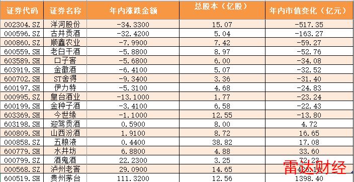 2月1日,洋河股份收报于201.66元,跌幅为1.15%。至此,洋河股份年内合计跌幅达14.55%,市值年内蒸发达517.35亿元,超过排在第二位的古井贡酒两倍,在A股18家白酒企业中市值“蒸发榜”第一。