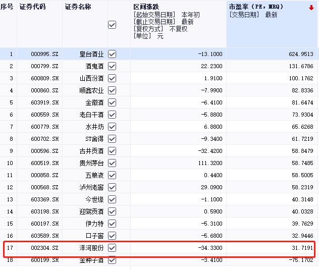 从相对估值来看,目前洋河股份市盈率为31.72倍,在全行业位列倒数第二。