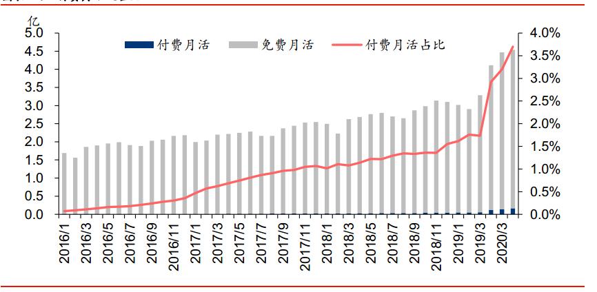 从付费月活占比看,2015年以来,付费月活占比不断提升至2020年6月3.7%。