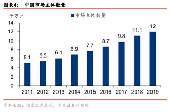 从2011年到2019年中国市场主体数量迅速上升,根据国家总局:数量从5100万户增长至1.2亿户。