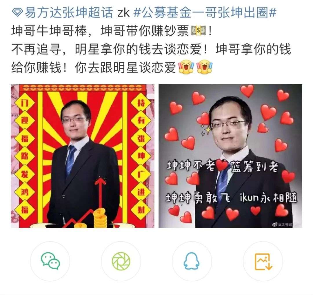 在近日的白酒下跌行情中,此前重仓白酒的易方达蓝筹精选更逆势上扬。于是,持有基金的投资者们仿照“饭圈”做法,组建起“易方达张坤全球后援会”,制作张坤的表情包;“坤坤勇敢飞,iKun永相随”,每天有“粉丝”打卡签到。1月26日,“张坤”一词更是一度冲上微博热搜榜第四。