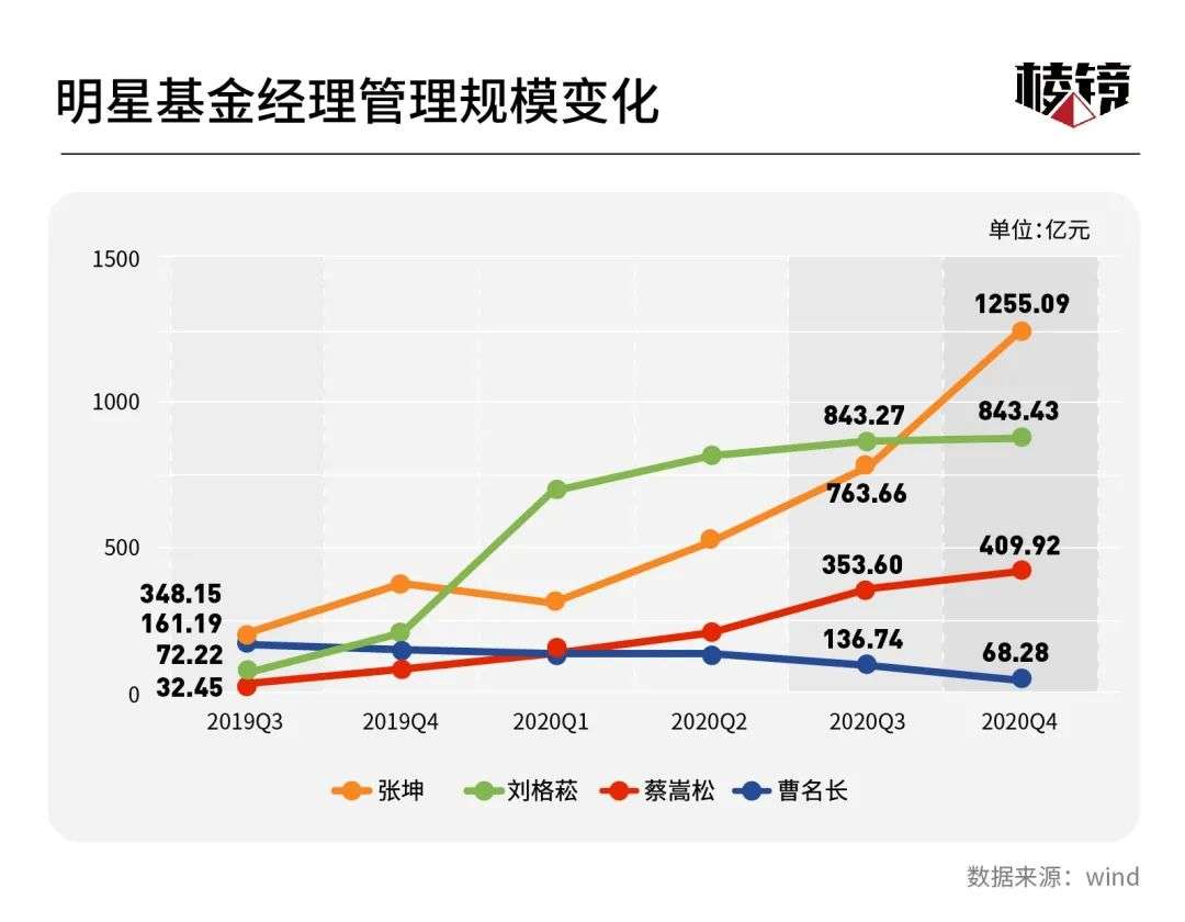 但张坤显然集聚了最多的投资者人气。基金2020年四季报显示,张坤以1255.11亿元的在管规模,成为公募基金历史上首位在管主动权益类规模超千亿的基金经理。此前,规模冠军宝座属于广发基金的刘格菘,截至2020年末,刘格菘在管基金规模为843.43亿元。