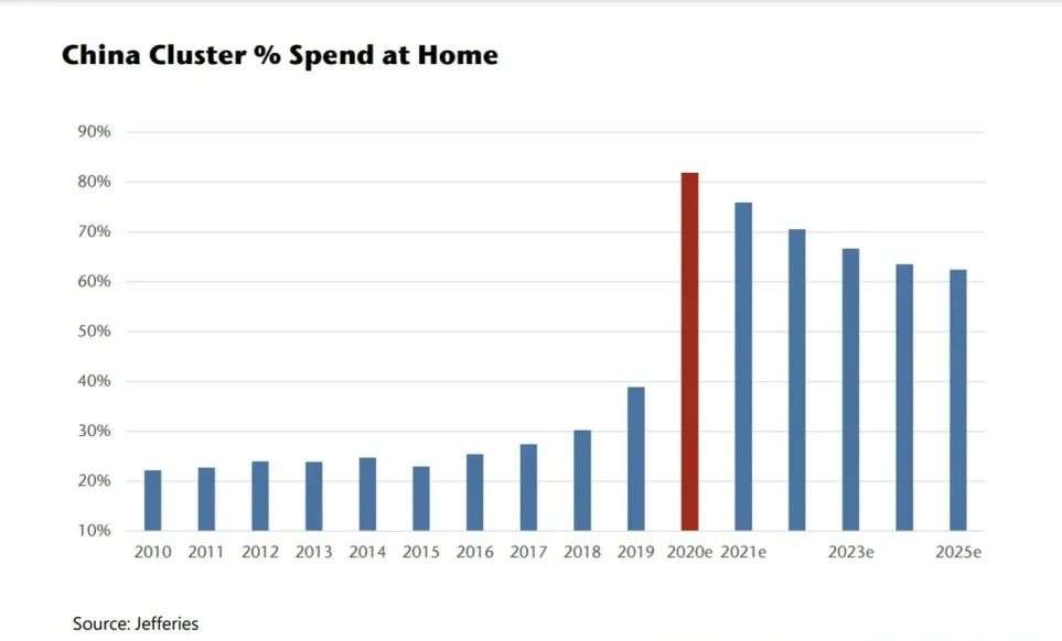投行杰富瑞在去年下半年发布的研究报告更直言,中国是疫情下全球奢侈品行业的中坚力量,去年中国消费者在本土市场的奢侈品消费在全球奢侈品消费中的占比达到80%,创历史新高,消费回流使得一些奢侈品牌的境内消费出现两位数甚至三位数的增长。