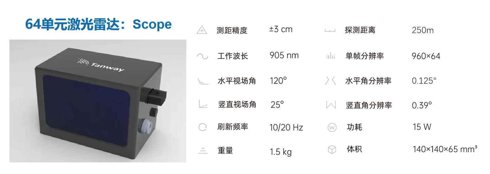 如果将Scope的核心参数与目前市场上主流的高线数激光雷达产品对比,可以发现这款产品在测距范围、视场角、距离精度等方面都已经达到了行业头部水平。