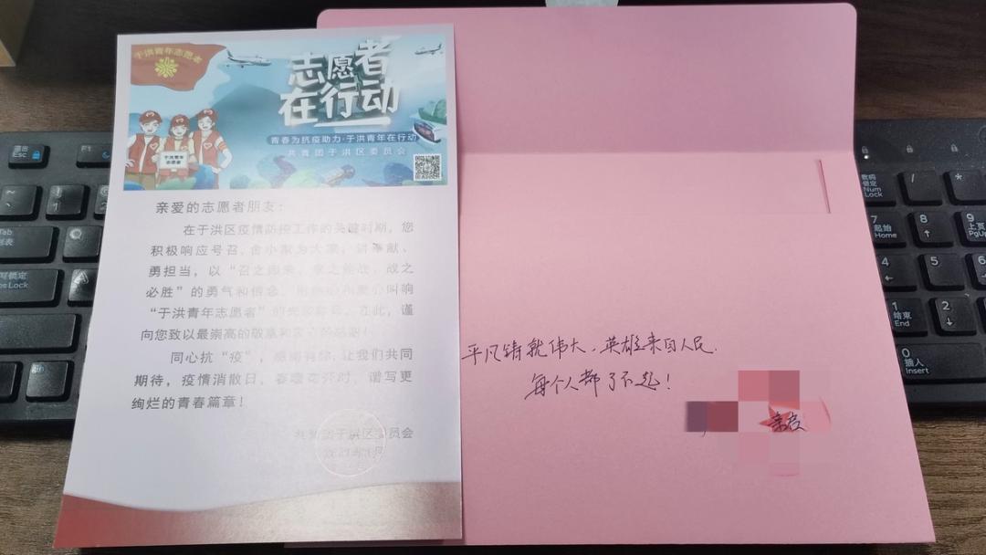 前些日子,共青团于洪区委为我院志愿者送来了感谢卡和锦旗。我们医院大约60%的员工都参加了志愿者工作,虽然我不是医务人员,但是能为防疫工作略尽绵力,还是很有成就感的。