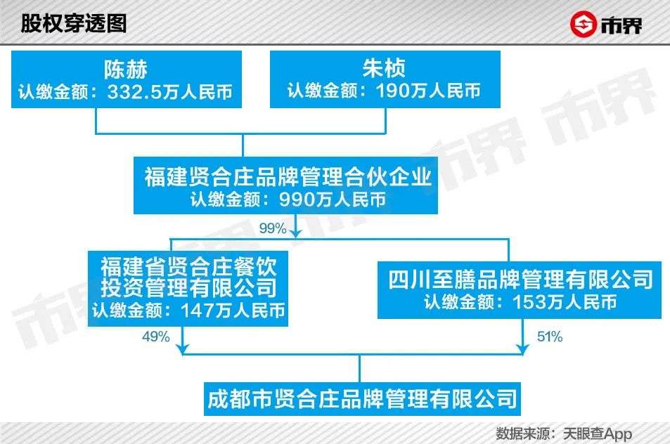天眼查App显示,成都贤合庄的背后股东中,至膳品牌持股51%,福建贤合庄餐投公司持股49%。而福建贤合庄餐投公司背后的大股东为福建贤合庄品牌管理合伙企业,陈赫在这家公司的认缴金额为332.5万元。
