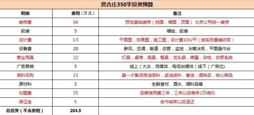 合计下来,在北京加盟一家贤合庄火锅店,不算房租、人员工资、食材,仅初始费用就在200万元以上。