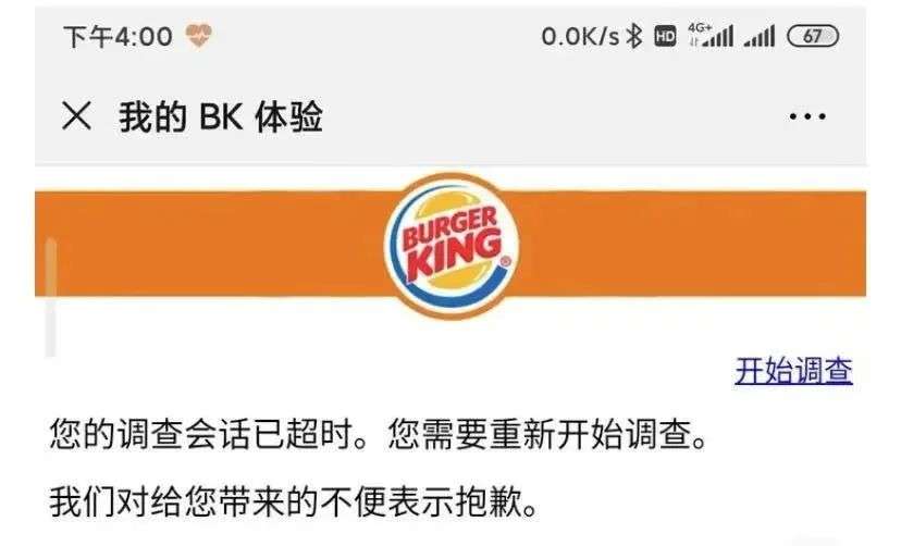 有网友指出,自己曾经在汉堡王官方公众号上投诉,耐心填完了一长串问题,终于可以提交,却显示已经超时,需要重新回答。